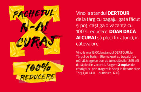 DERTOUR, liderul pieței de turism din România vine cu o promoție inedită la Târgul de Turism de la Romexpo, între 14-17 noiembrie, și lansează în premieră pachetul „N-ai curaj să pleci chiar acum în vacanță”. DERTOUR premiază spontaneitatea și invită pasionații de călătorii să se înscrie în cursa pentru câștigareaAfla mai multe!