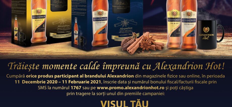 În perioada 11.12.2020-11.02.2021 cumpără orice produs participant Alexandrion – Alexandrion HOT (pachet cu Alexandrion 5* sau 7*, cană şi ingrediente pentru preparea băuturii), Alexandrion 7* (1 L, 0,7 L şi 0,5 L) şi Alexandrion 5* (1,75 L, 1 L, 0,7 L şi 0,5 L), trimite SMS cu data şi numărul bonului fiscal la 1767 sau ȋnscrie-te pe site-ul campaniei www.promo.alexandrionhot.ro.